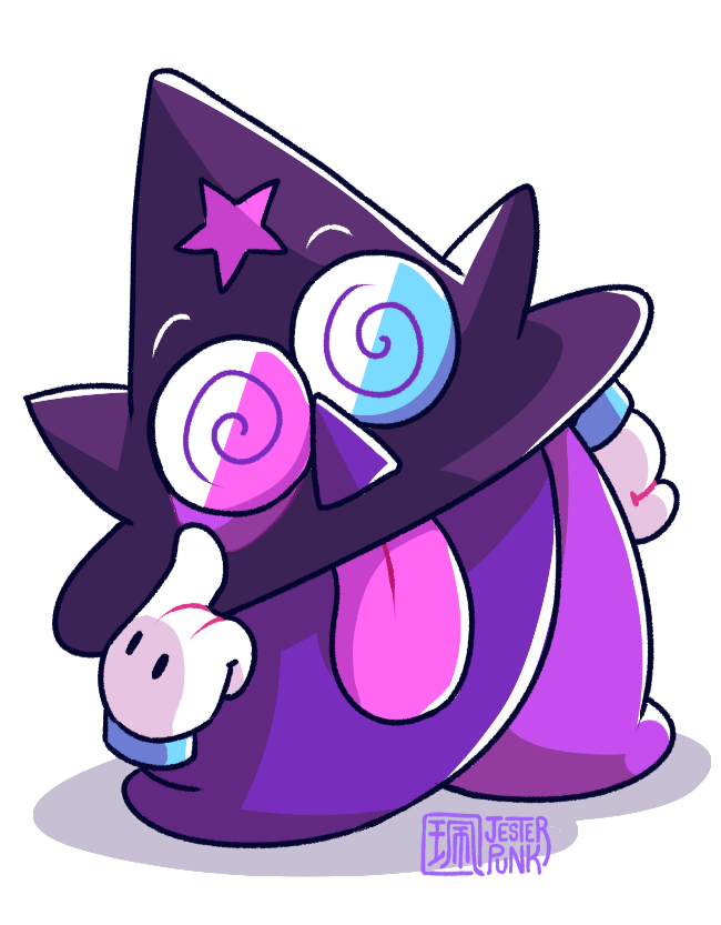 Laszlo is a local, professional evil wizard. he doesn't really know any of the others, but seems to have some kind of obsession with cursing Lex specifically. besides lex and Jester, no one seems to really believe laszlo exists.their appearance and anatomy are very unclear. they have pointy ears and a tail, and seem to have a mouth under their hat, but their hands/gloves are fully empty and assumed to be controlled by magic.