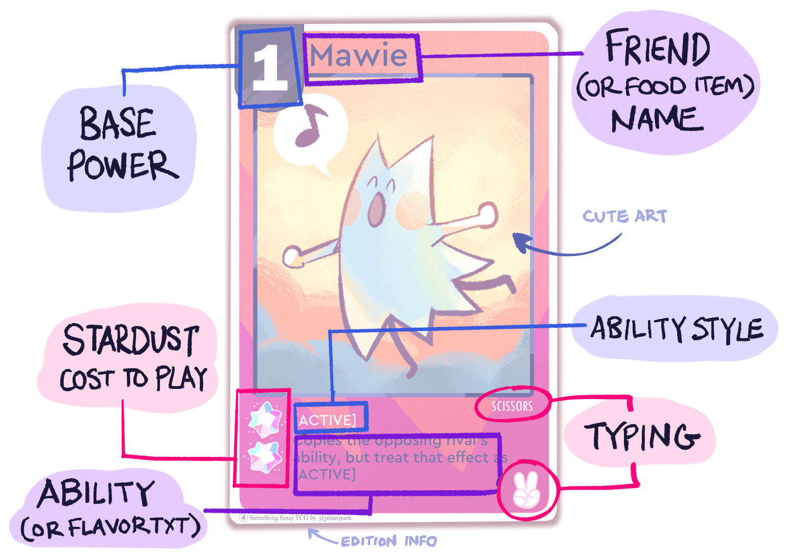 Edge cases / Rule clarifications:- When two Paper Jesters that "Always win Stalemates" are opposing eachother, both are knocked out during the attack phase.- When the Rock Sookie says she always takes Knockout damage from Mawies, this does NOT include theTypeless Mawie wearing a moustache, as she cannot recognise this as a Mawie,- The Rock Sookie does get knocked out by the 3 Stardust Typeless Mawie that instantly knocks their opponent out, as that Mawie's ability would apply regardless of power values.- When any Mawie attacks the Rock Sookie during the Mawie's attack phase, the Mawies do not knock themselves out despite being lower Power value. (Treat this as if Rock Sookie has a 0 power against any Mawie)- When a card opposes Typeless Jester that removes the opposing rival's abilities, the Typeless Jester always has priority (If the Typeless Jester was played first, it's [ongoing] ability style overrides a newly placed opponent's. If the Typeless Jester is played second, for example, after an opposing Scissors Mawie that copies opponent's ability , the Jester still has priority, as that Mawie's power is only active on her turn.)