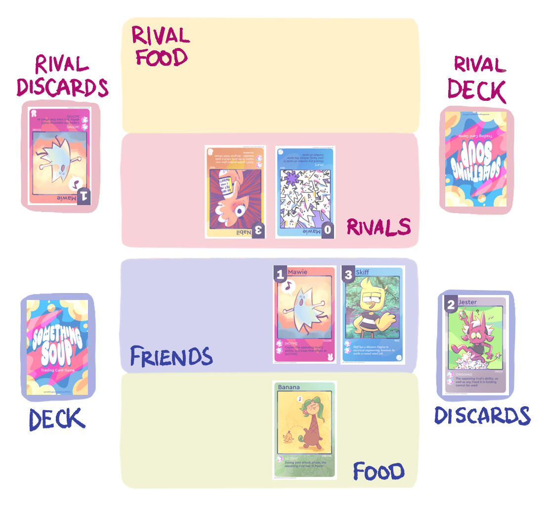 The Something Soup Trading Card Game is a 1-vs-1 card game played with a custom deck. The aim of the game is to end your turn with 4 Friends of different names on your side of the board.